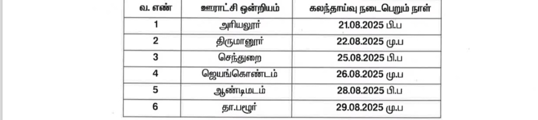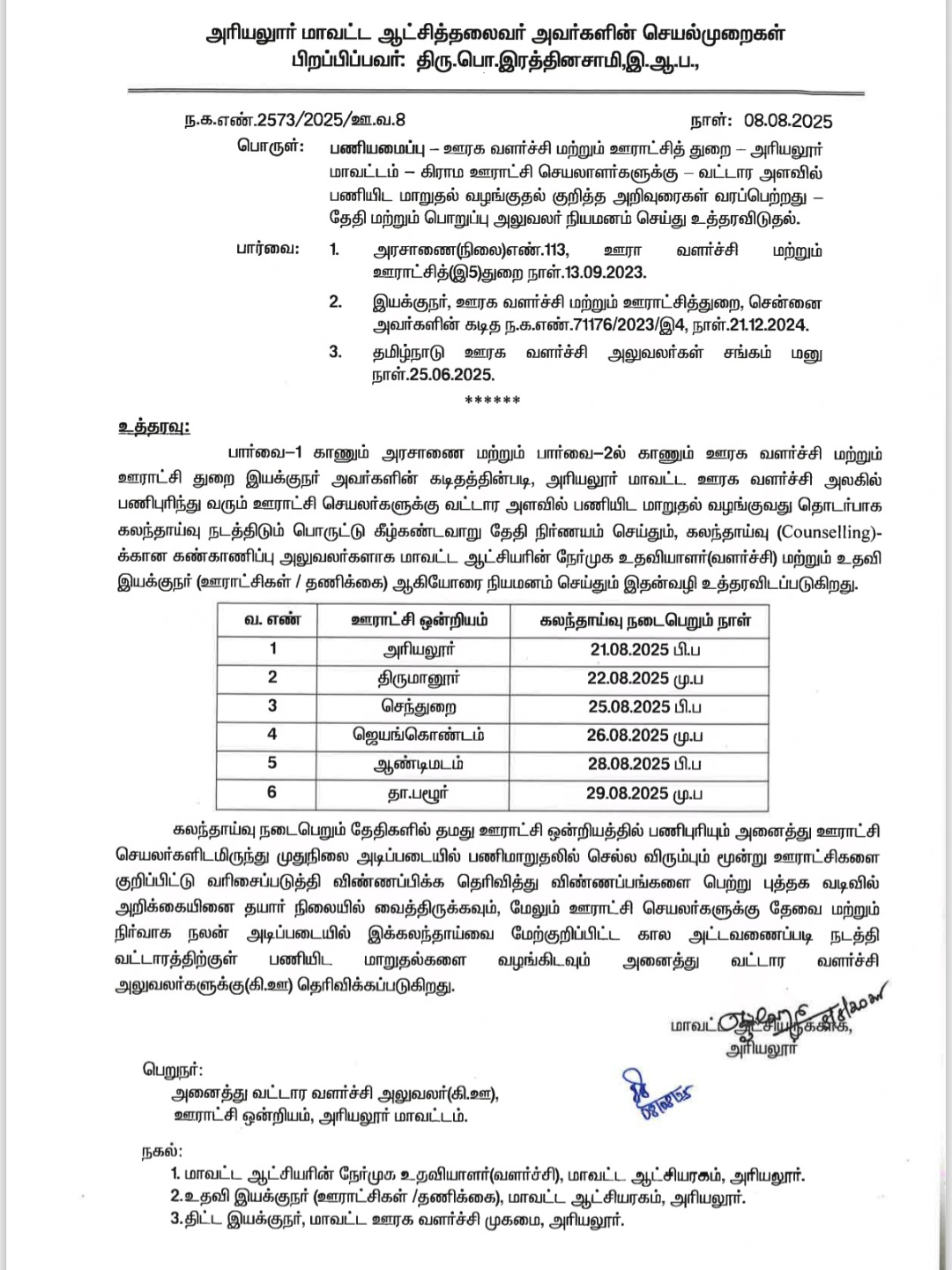 அரியலூர் மாவட்ட ஊரக வளர்ச்சி அலகில் பணிபுரிந்து வரும் ஊராட்சி செயலர்களுக்கு வட்டார அளவில் பணியிட மாறுதல் வழங்குவது தொடர்பாக கலந்தாய்வு நடத்திடும் பொருட்டு கீழ்கண்டவாறு தேதி நிர்ணயம் செய்தும், கலந்தாய்வு (Counselling)-க்கான கண்காணிப்பு அலுவலர்களாக மாவட்ட ஆட்சியரின் நேர்முக உதவியாளர்(வளர்ச்சி) மற்றும் உதவி இயக்குநர் (ஊராட்சிகள் / தணிக்கை) ஆகியோரை நியமனம் செய்தும் இதன்வழி உத்தரவிடப்படுகிறது.