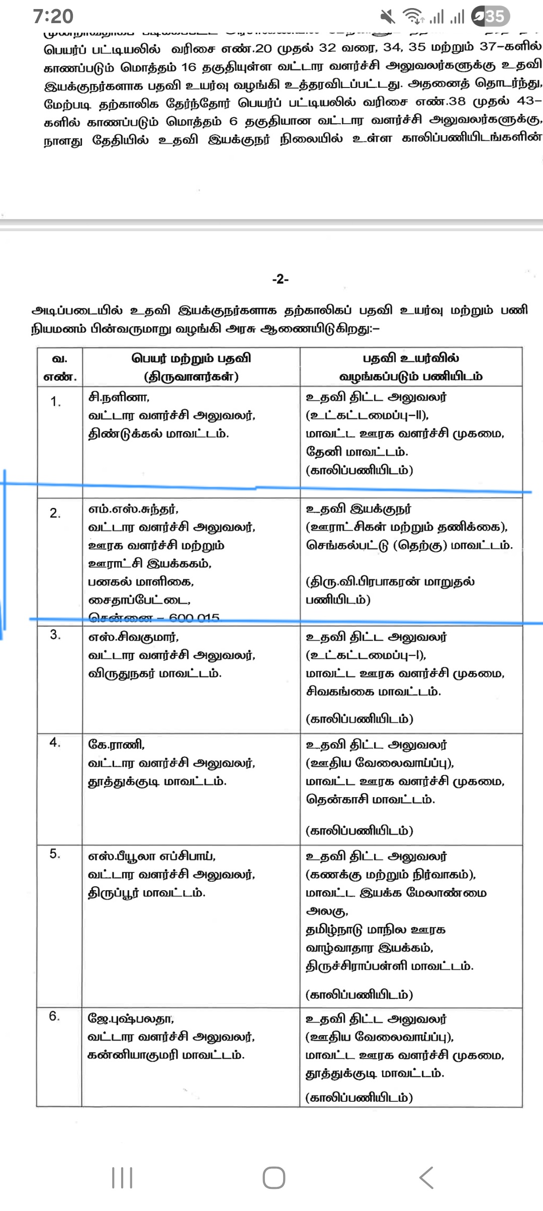 இதன் முதல் நியமனமாக ஊரக வளர்ச்சி துறை தலைமை அலுவலகத்தில் வட்டார வளர்ச்சி அலுவலராக பணியாற்றி வந்த சுந்தர் என்பவர் பதவி உயர்வில் செங்கல்பட்டு தெற்கு மண்டல உதவி இயக்குநர் ( ஊராட்சிகள் மற்றும் தணிக்கை) ஆக நியமிக்கப்பட்டுள்ளார்.