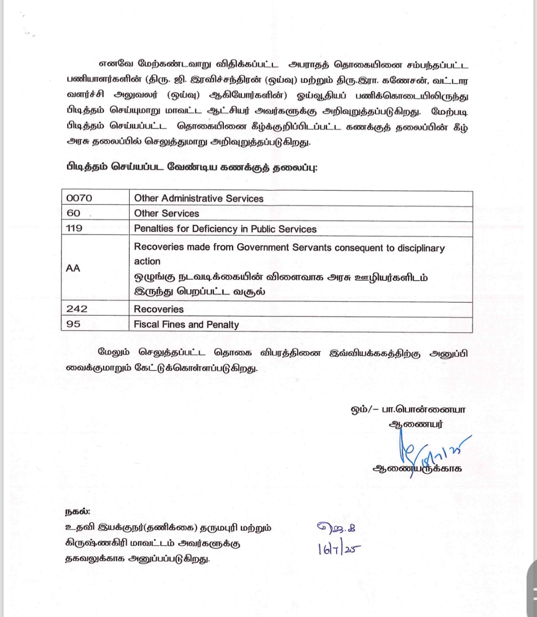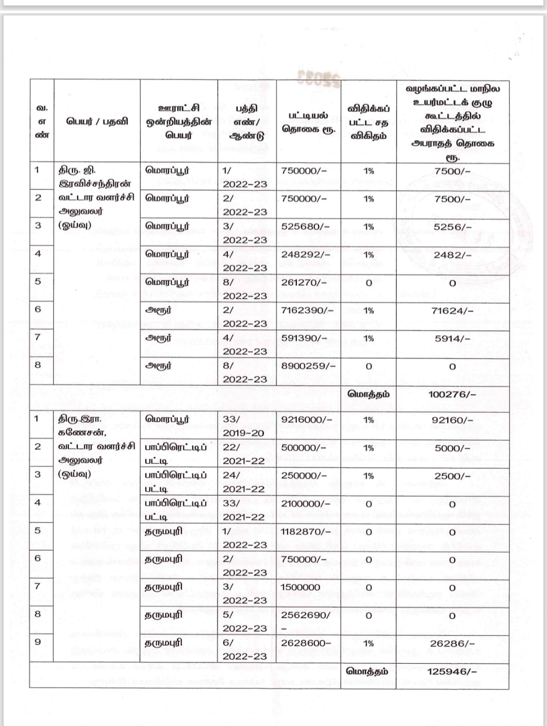 கடும் குறைபாடு உடைய நிலுவை தணிக்கை தடைகள் காரணமாக, ஒரு மாவட்ட அளவிலான உயர்மட்ட குழுவில் இந்த இரண்டு வட்டார வளர்ச்சி அலுவலர்களுக்கும் தலா ஒன்பது லட்சம் மற்றும் 12 லட்சம் அபராதம் விதித்து ஆணை இடப்பட்டது.